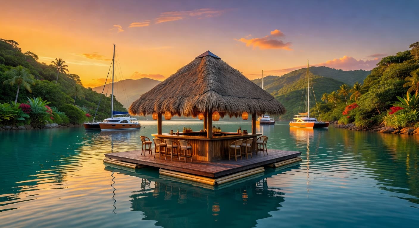 A floating bar in the protected waters of Mt. Hartman Bay. Drinks, food, marine adventures, and the most unique sunset in Grenada.
